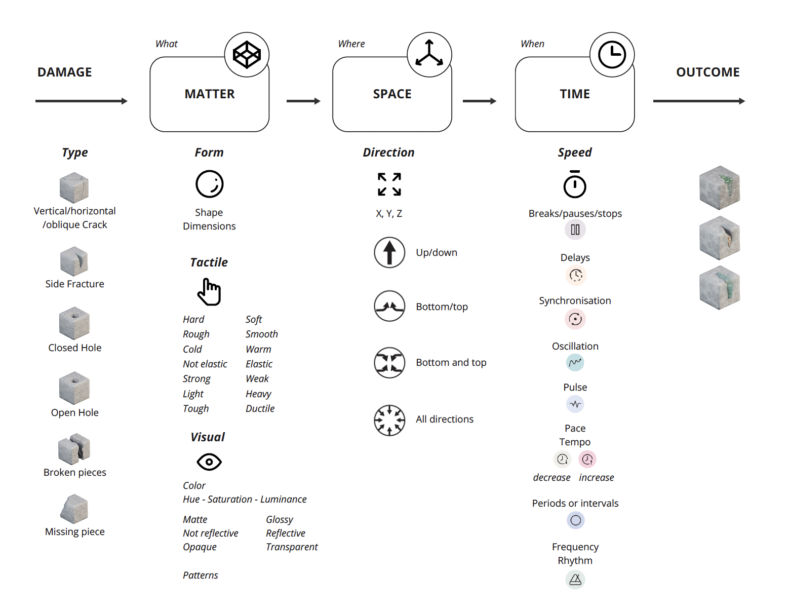 Structured around three core dimensions: matter, space, and time, the toolkit includes a taxonomy, vocabulary, visual stickers, and an annotation template for documenting and reimagining sensory (form, visual, and tactile) and spatiotemporal (direction and speed) characteristics of self-healing processes.